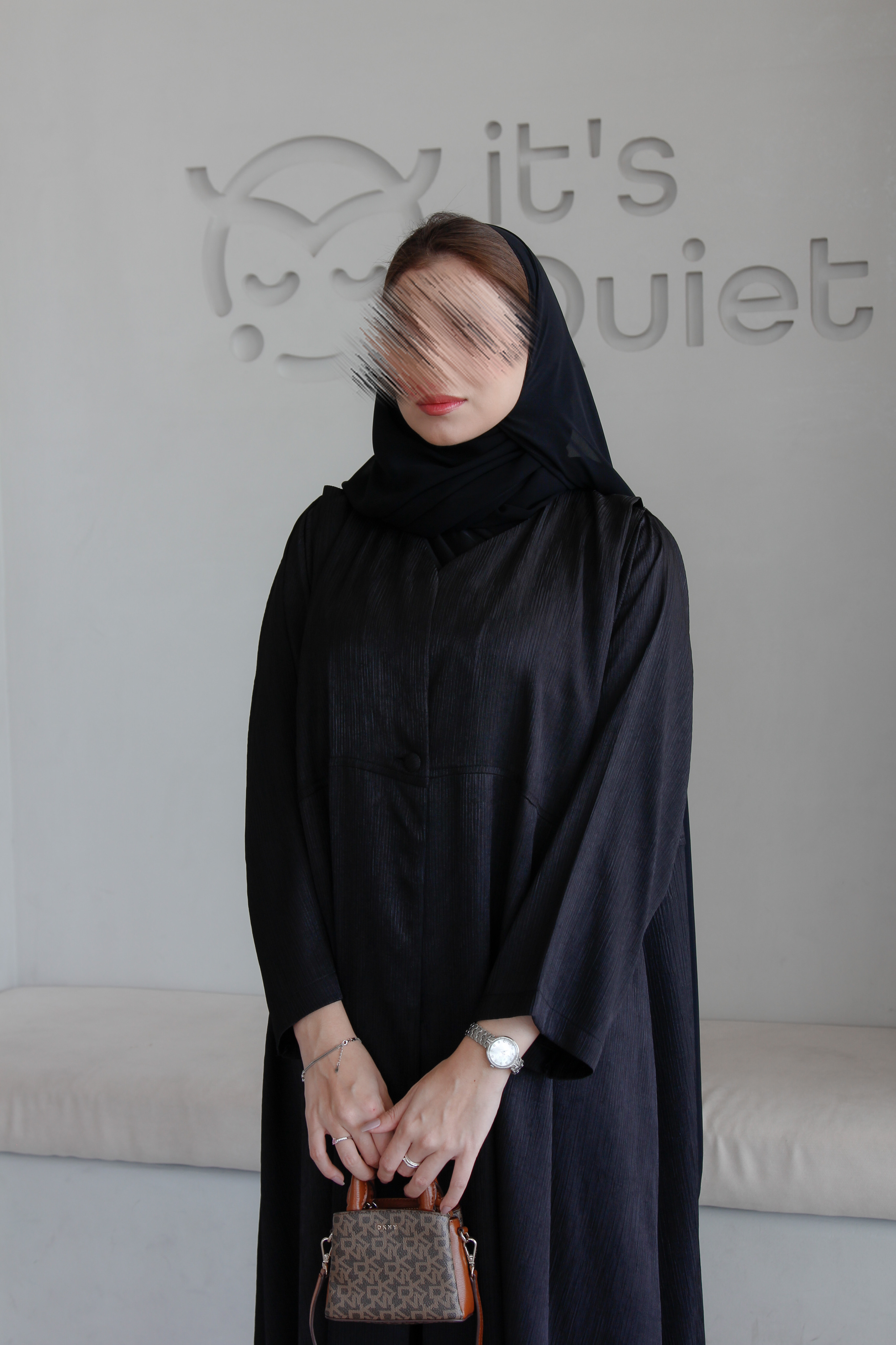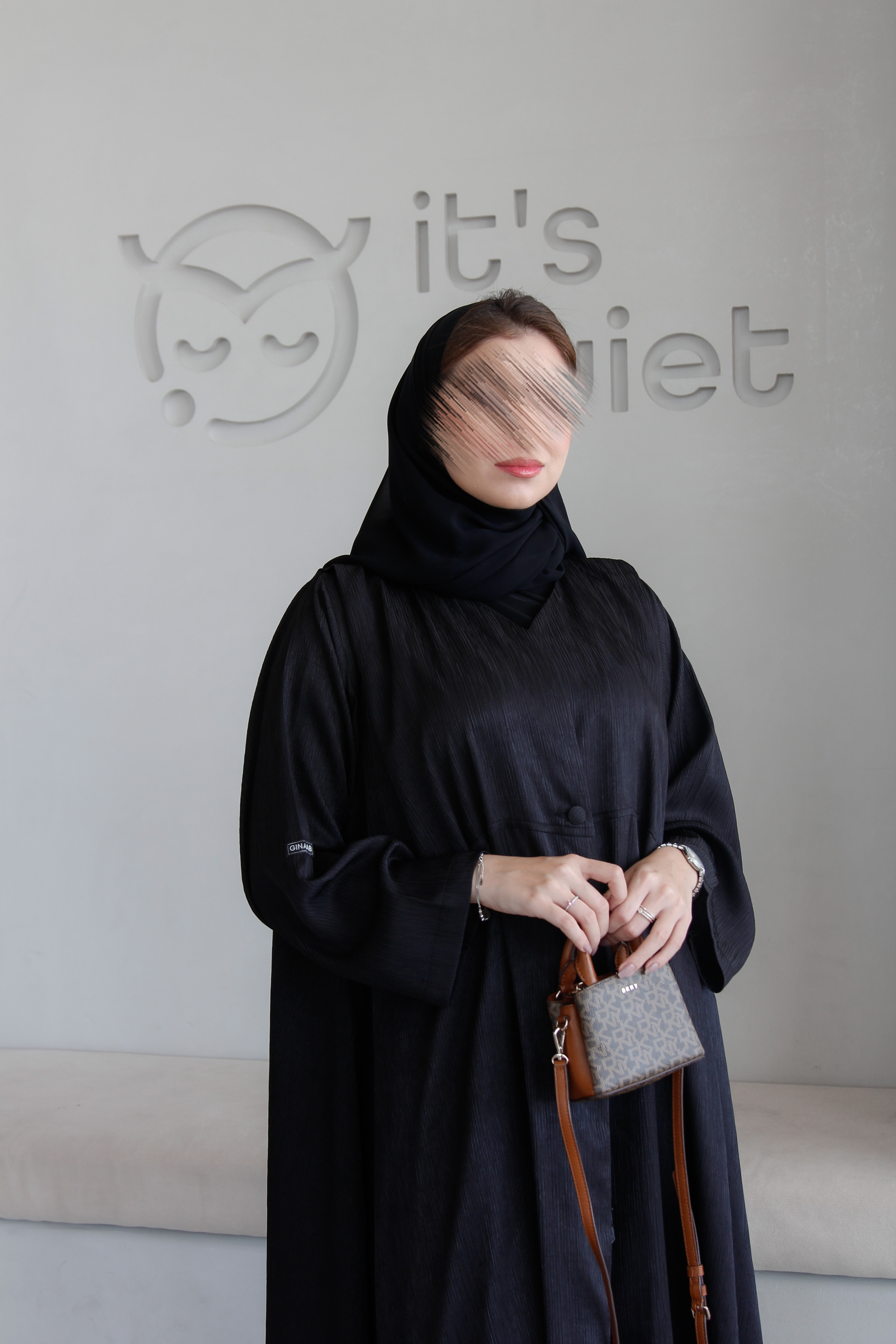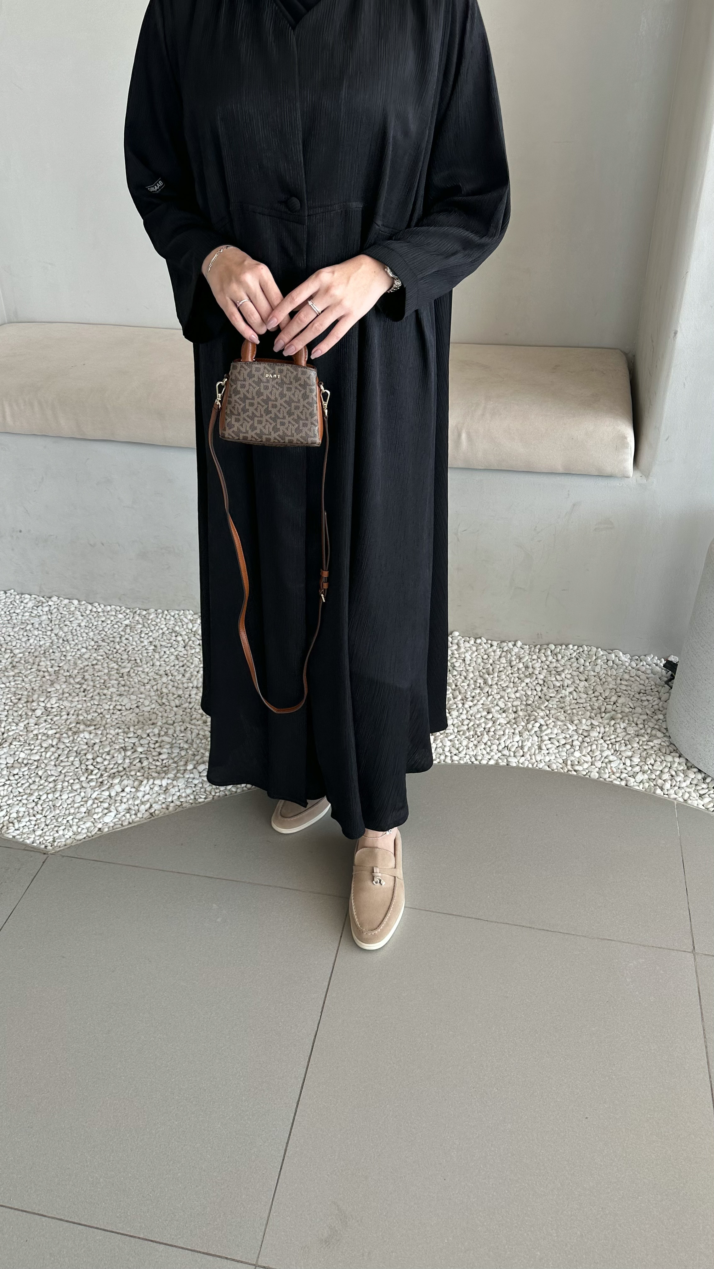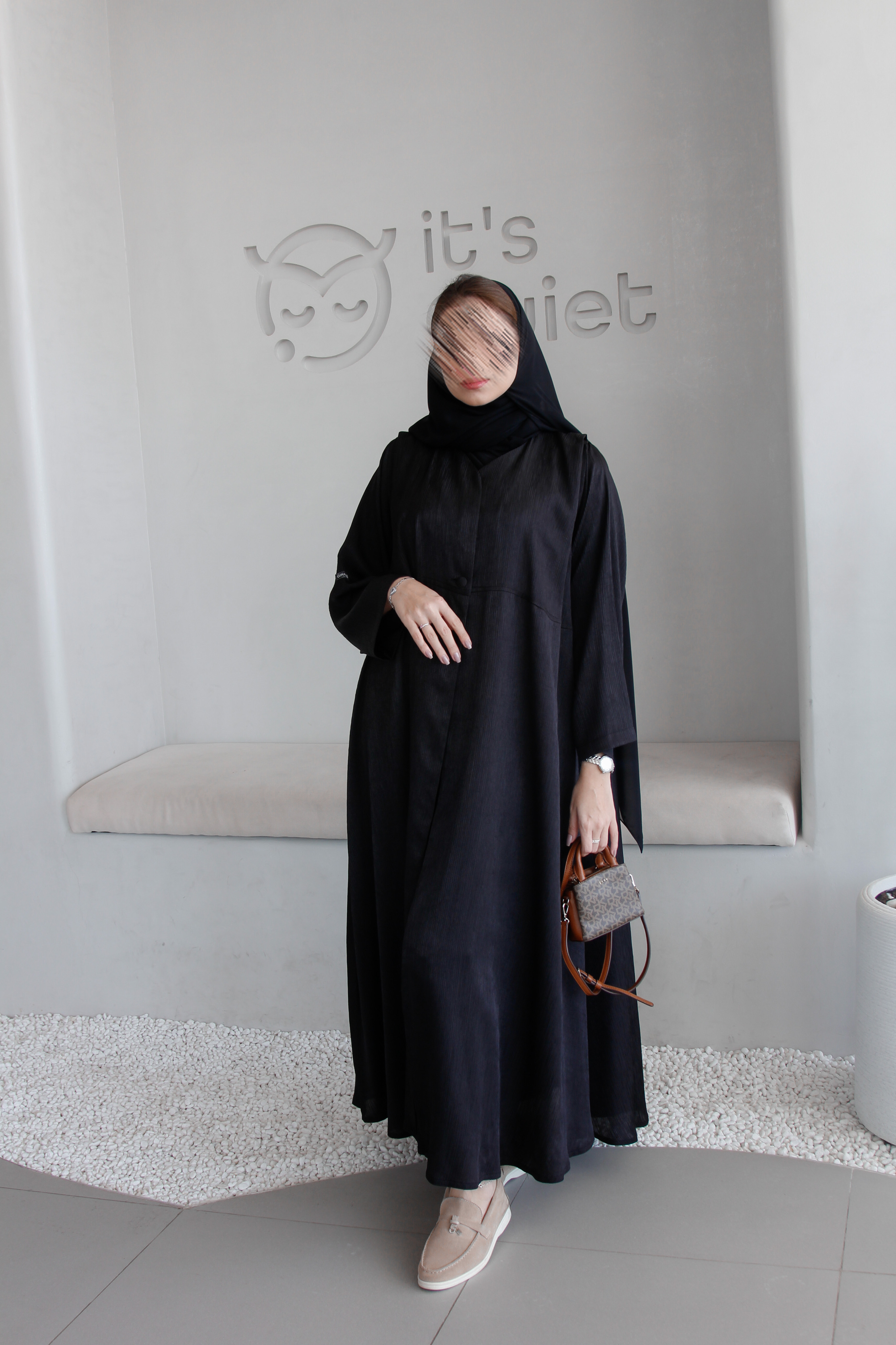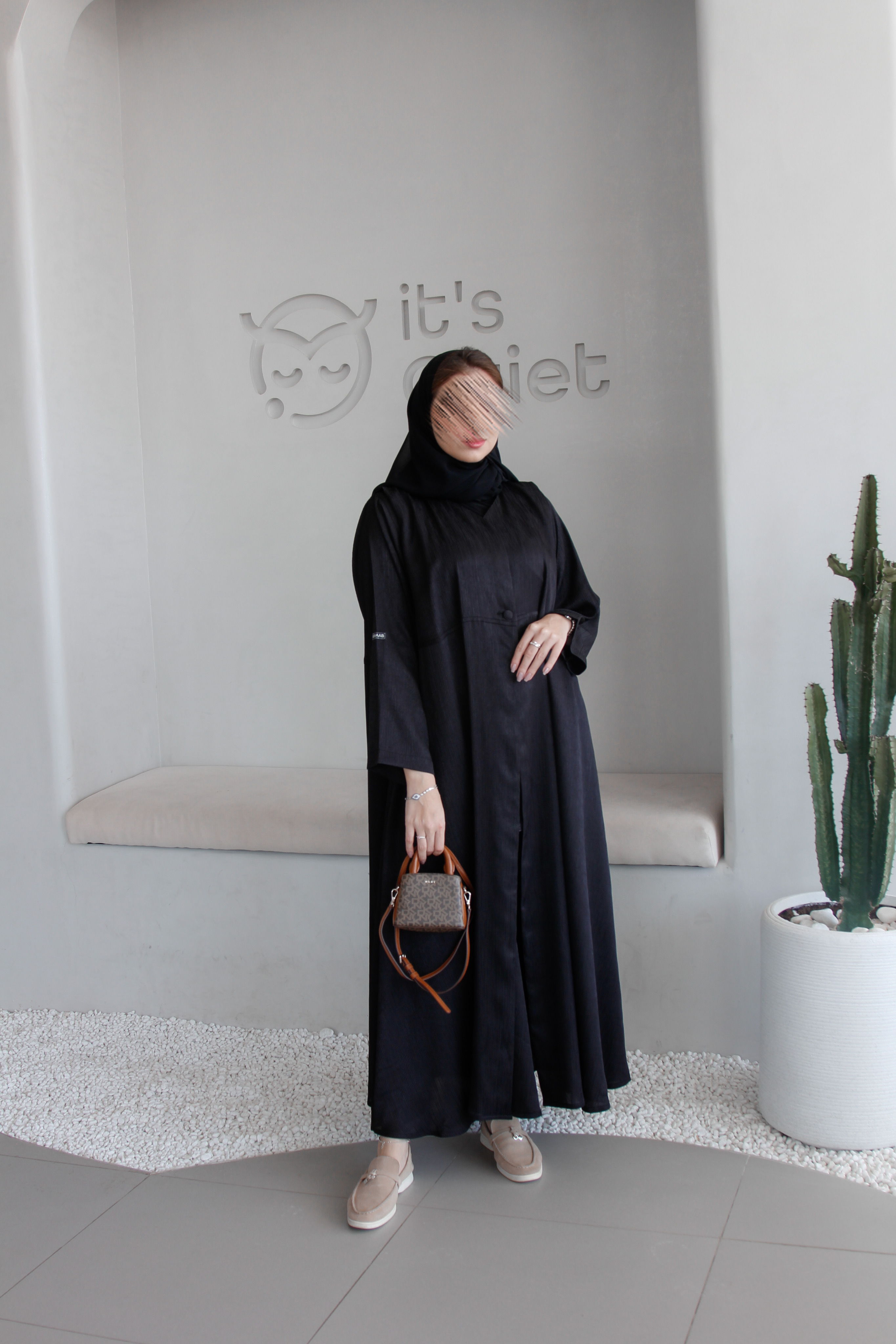 The abaya has only one button from the front, like the picture. If you want buttons to the end, please put a note in the note box. Also, the abaya comes with a wider cut than the original size, just write your original size.